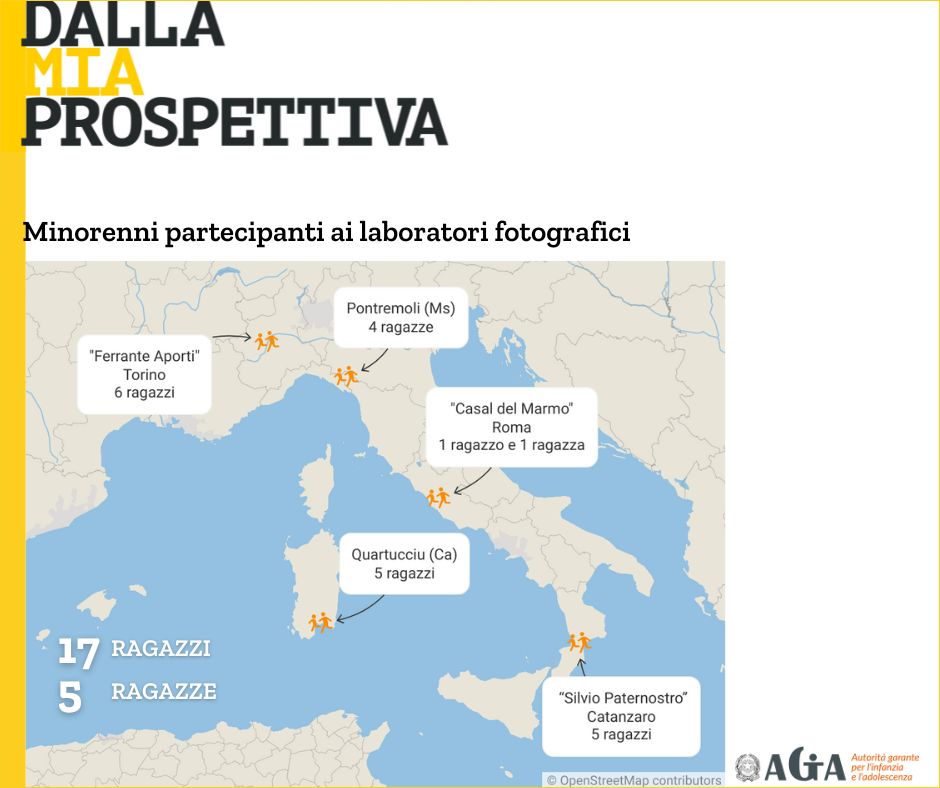 L’Autorità garante per l’infanzia e l’adolescenza (Agia) Marina Terragni ha presentato questa mattina a Firenze “Dalla mia prospettiva”, una mostra che raccoglie le fotografie scattate dalle ragazze e dai ragazzi di cinque istituti penali per minorenni.