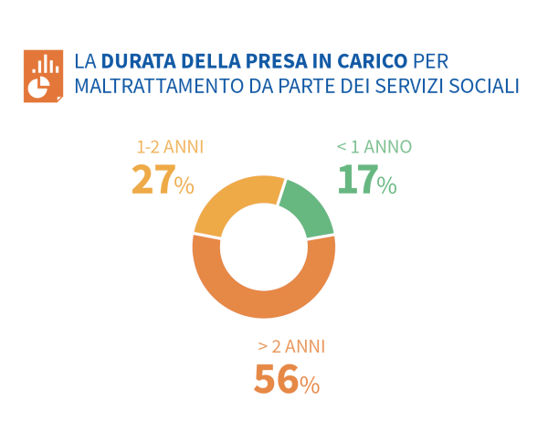 La durata della presa in carico da parte dei servizi sociali è nella maggioranza dei casi (56%) superiore ai due anni, a indicare la complessità delle situazioni trattate e la necessità di interventi continuativi. Tuttavia, si registrano forti differenze territoriali: al Sud e nelle Isole, i percorsi di presa in carico sono più brevi e in media durano meno di due anni. Questo potrebbe riflettere una minore disponibilità di risorse, una maggiore discontinuità nei servizi o un approccio meno strutturato all’accompagnamento delle situazioni.
