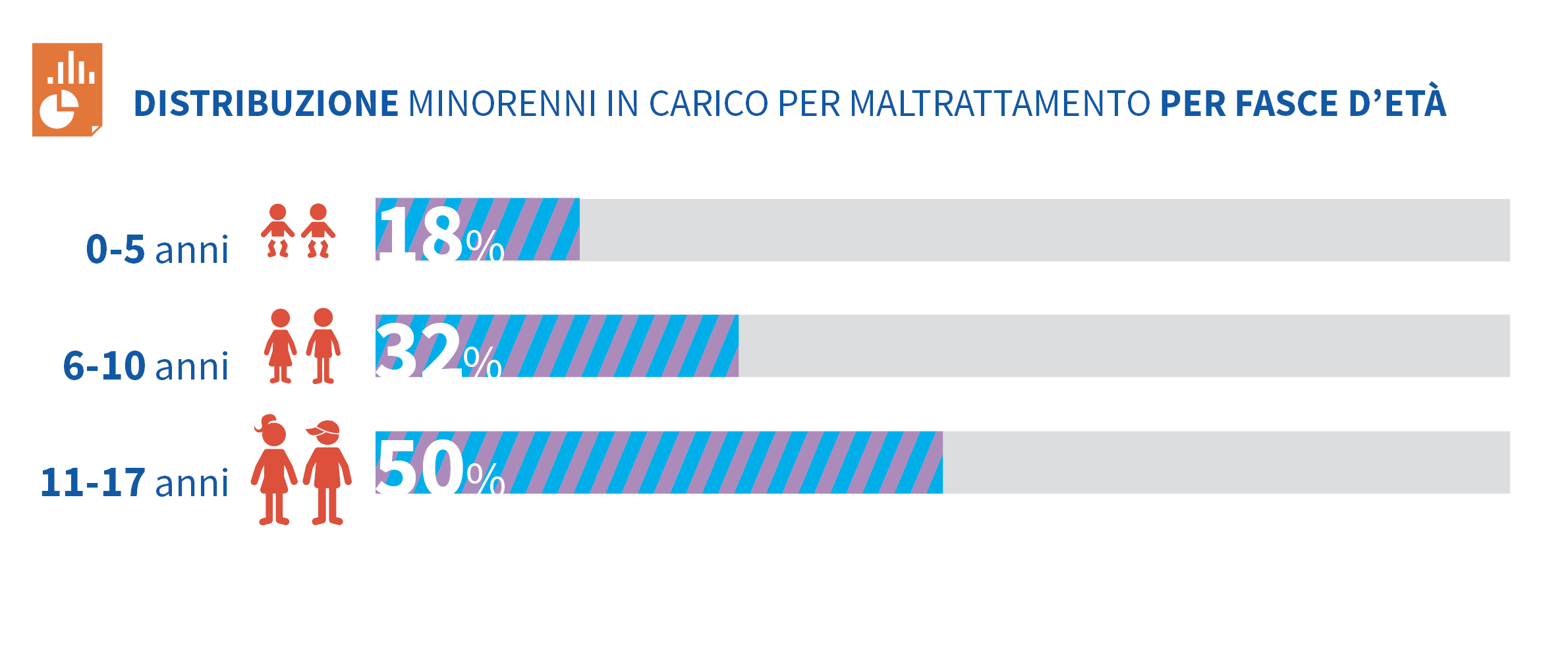 L’indagine rileva che i minorenni di genere maschile in carico ai Servizi Sociali per maltrattamento risultano essere 57.963, rappresentando il 51% in carico per maltrattamento; mentre le femmine risultano essere 55.929, pari al 49%. La distribuzione è in linea con l’andamento demografico della popolazione minorile italiana.