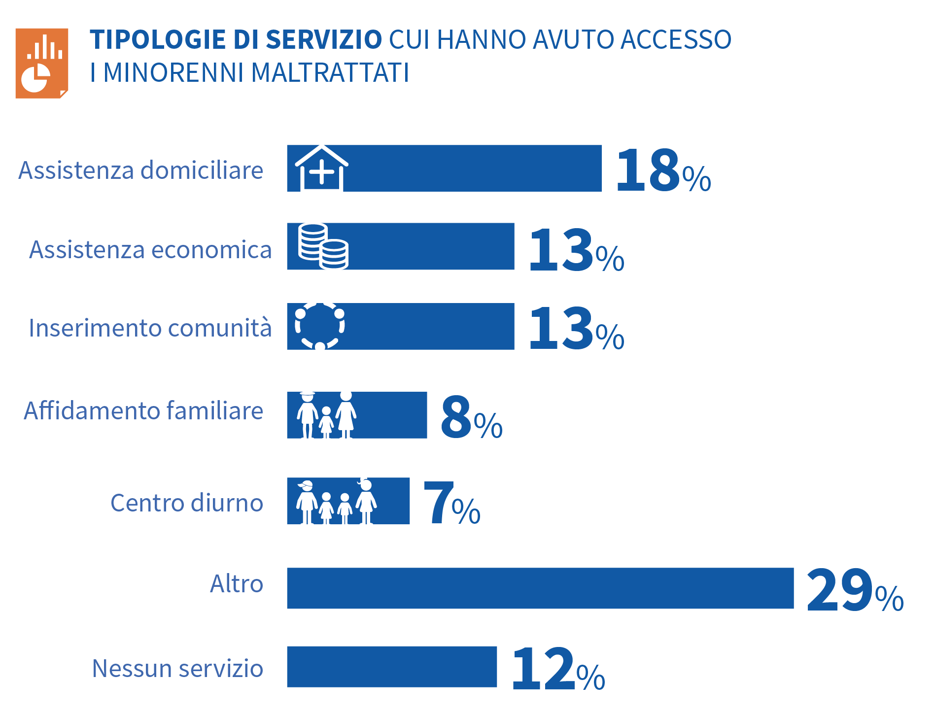 L’assistenza domiciliare (18%), l’inserimento in comunità (13%) e l’assistenza economica (13%) rappresentano le forme più strutturate di sostegno, ma anche in questo caso la distribuzione varia significativamente tra aree geografiche e tipologie comunali.