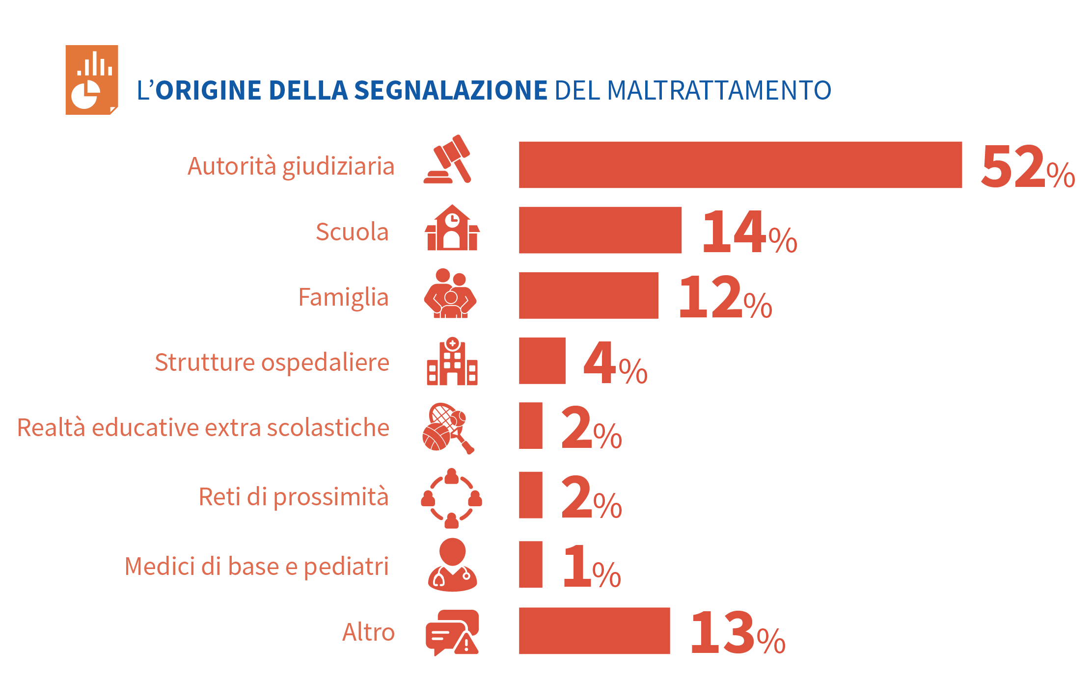 Chi segnala nel 52% dei casi è l’Autorità giudiziaria a segnalare il caso ai servizi sociali. Si tratta di un dato emblematico di un sistema di protezione che si attiva tardi, spesso solo quando il danno è già conclamato e viene formalmente rilevato. Le istituzioni educative – in particolare la scuola – contribuiscono solo nel 14% dei casi. Ancora più marginale è il ruolo delle famiglie (12%) e, soprattutto, delle strutture sanitarie, come ospedali e ambulatori, che nel complesso segnalano solo il 4% dei casi. Infine, i medici di base e i pediatri, pur essendo figure potenzialmente strategiche nella prevenzione e nell’individuazione precoce del maltrattamento, risultano pressoché assenti, con una percentuale dell’1%. L’indagine per la prima volta prende in considerazione anche il contesto sportivo quale fonte di segnalazione, che però non raggiunge una stima statisticamente diversa da zero.