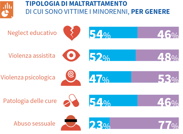 Si notano inoltre differenze di genere nelle forme di violenza: i maschi sono più frequentemente vittime di neglect educativo, (54%), violenza assistita (52%) e patologia delle cure (54%) mentre le femmine sono più esposte ad abuso sessuale (77%) e violenza psicologica (53%).
