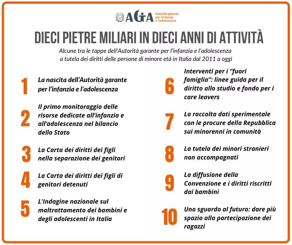 “Dieci anni rappresentano una tappa importante per una delle autorità più giovani del panorama istituzionale italiano” osserva Garlatti. “Il compito di raccogliere le esigenze dei minorenni in Italia e portarlo all’attenzione delle istituzioni, oltre a quello di promuoverne i diritti, è stato svolto cercando di definire ruolo e poteri di un soggetto indipendente, che si è sentito in dovere di incidere nel cambiamento della società così da farla divenire più rispettosa dei diritti di bambini e ragazzi. Ora occorre fare un passo in avanti: da un lato con il rafforzamento dei poteri dell’Autorità, come si propongono alcune iniziative di legge, dall’altro sviluppando la partecipazione dei minori alle decisioni che li riguardano”.