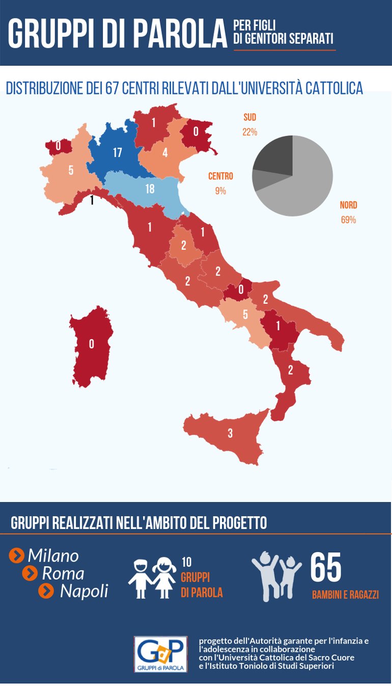 Annunciata la pubblicazione sul sito dell’Agia (qui l’elenco aggiornato al 30 maggio 2019) e dell’Università Cattolica (www.unicatt.it/consultoriofamiliare e progetti.unicatt.it/progetti-milan-psicologia-clinica-home) di un primo elenco dei centri in Italia rilevati dall’Università Cattolica dove si realizzano i Gruppi di Parola destinata a essere aggiornata dinamicamente. Da esso è possibile ricavare i recapiti dei GdP regione per regione, ove presenti. Accanto a destra la mappa (aggiornata al 3 dicembre 2018).