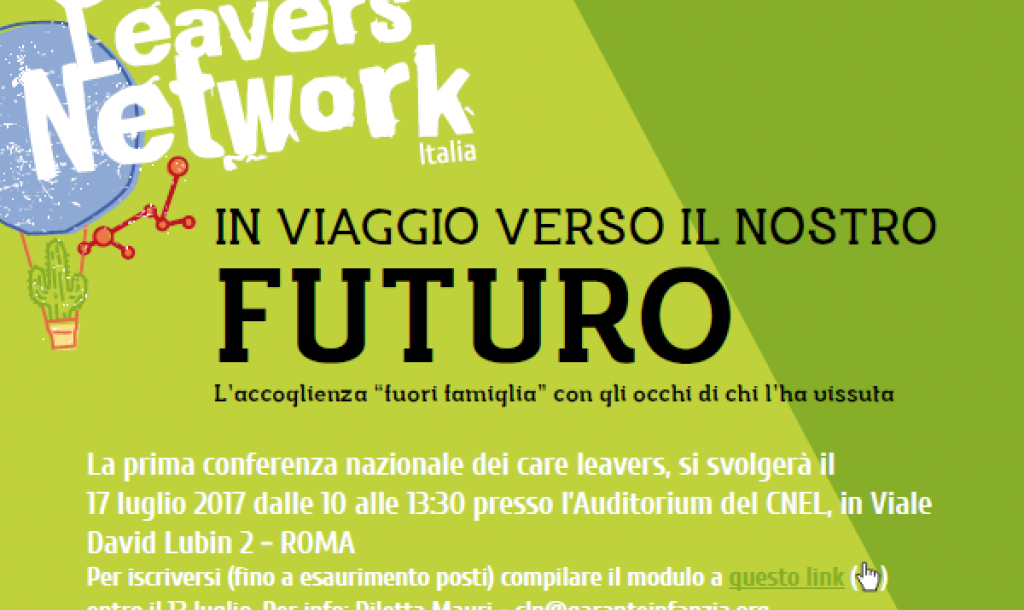 La prima conferenza nazionale dei care leavers, si svolgerà il 17 luglio 2017 dalle 10 alle 13.30 presso l’Auditorium del CNEL, in Viale David Lubin 2 – ROMA