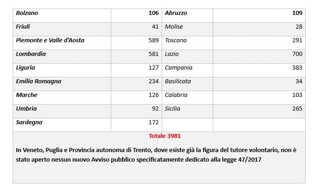 “Si tratta di un dato significativo – commenta l’Autorità garante – che dimostra la straordinaria partecipazione con cui le persone stanno rispondendo all’ appello a far da guida ai tanti ragazzi che arrivano nel nostro paese senza adulti di riferimento. Un patrimonio di generosità e solidarietà che non può e non deve andare perduto: per questo è fondamentale che i percorsi formativi vengano attivati in tutte le regioni, che i Tribunali per i Minorenni procedano con speditezza alle nomine dei tutori, che siano riconosciuti alle nuove figure polizze assicurative, permessi di lavoro e rimborsi per le spese vive sostenute. Tutti abbiamo la responsabilità di valorizzare e sostenere i tanti cittadini che, fidandosi di noi, si sono dichiarati disponibili a svolgere il ruolo di tutore”.