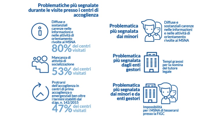 Nell’80% dei 15 centri visitati sono risultate carenti informazioni e orientamento, nel 53% di essi emerge la mancanza di attività di socializzazione, nel 47% delle 15 strutture coinvolte la permanenza in centri di prima accoglienza o emergenziali vanno ben oltre i 30 giorni previsti dalla legge. La problematica più segnalata dagli enti gestori è stata quella dei tempi gravosi per la nomina dei tutori. Ragazzi ed enti insieme hanno tra l’altro fatto rilevare l’impossibilità per i minori stranieri non accompagnati (Msna) di tesserarsi con la Federazione gioco calcio.