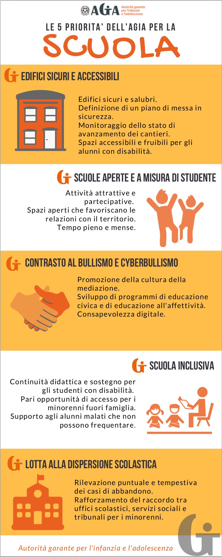 In occasione dell’avvio dell’anno scolastico l’Autorità garante per l’infanzia e l’adolescenza, Filomena Albano, ha segnalato al presidente del Consiglio Giuseppe Conte cinque tra le principali priorità a tutela, anche a scuola, dei diritti delle persone di minore età.