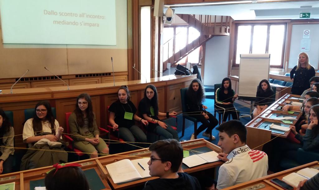 I due mediatori professionisti presenti all’incontro hanno poi guidato i ragazzi in una riflessione sugli aspetti positivi del conflitto, che fa crescere e maturare: il conflitto non è qualcosa da cui scappare, ma qualcosa da affrontare in modo diverso da come siamo abituati a fare, con consapevolezza e con la voglia di confrontarsi.