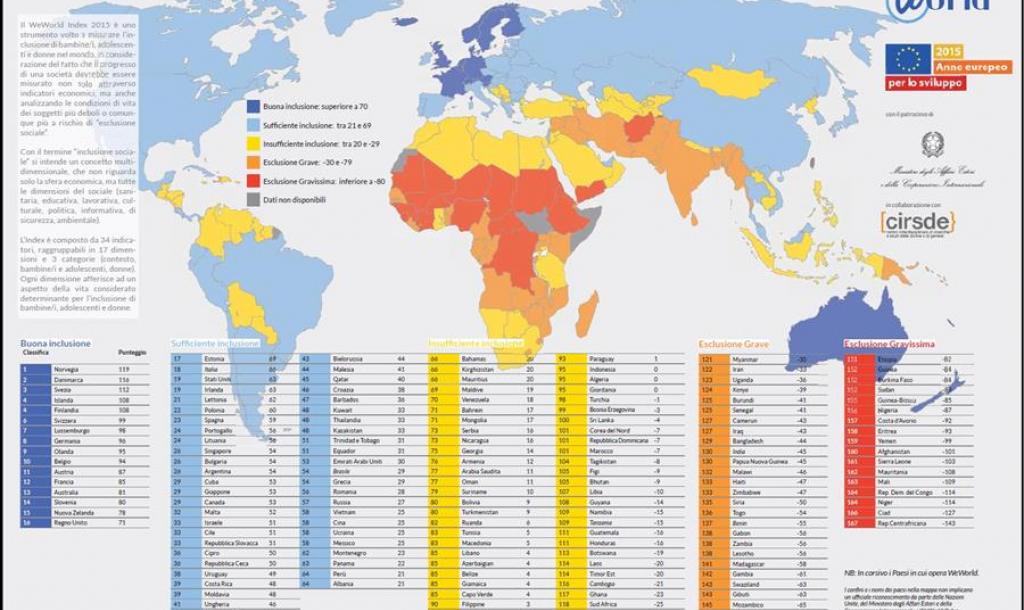 34 indicatori, 167 nazioni, 1 indice sintetico per misurare il valore dell’inclusione, partendo da donne e bambini che rappresentano il 70% della popolazione mondiale ma ancora oggi sono le categorie sociali più a rischio di esclusione. E’ il WeWorld INDEX 2015, il primo rapporto sulla condizione di bambine, bambini, adolescenti e donne nel mondo con il patrocinio del Ministero degli Affari Esteri e della Cooperazione internazionale presentato alla Farnesina da WeWorld Onlus, organizzazione no profit che opera in Italia e nel Sud del Mondo per la tutela dei diritti di donne e bambini.