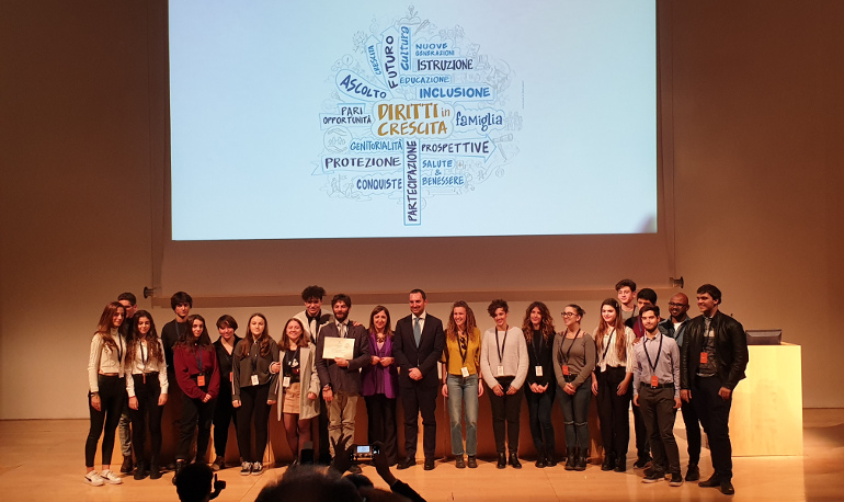 6. “Uno sguardo al futuro: la Convenzione riscritta dai ragazzi” è stata la tavola rotonda conclusiva, moderata da rappresentanti dalla Consulta delle ragazze e dei ragazzi dell’Autorità garante. Ad aprirla la proiezione del video Queencubo dei cori dei licei “Albertelli”, “De Sanctis”, “Keplero” e “Visconti” di Roma diretti da Dodo Versino che hanno ricevuto un riconoscimento dalle mani della Garante Filomena Albano e dal ministro Vincenzo Spadafora. È stata presentata la traduzione del commento generale ONU sul superiore interesse di bambini e ragazzi. Sono intervenuti Fabrizio Petri, presidente CIDU – Comitato interministeriale per i diritti umani, Paolo Rozera, direttore generale del Comitato italiano per l’Unicef. Illustrate le proposte dei ragazzi del progetto ENYA (European Network of Young Advisors) e della Consulta dell’Autorità garante.