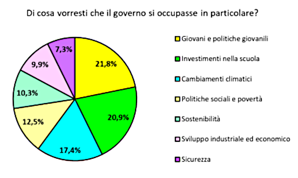 I ragazzi sono convinti (molto il 27,6% e piuttosto il 41%) che esistano canali e modalità per far sentire la loro voce. Tuttavia, il 79,9% ritiene che lo Stato faccia poco per i giovani. Di cosa si dovrebbe occupare il governo? Per il 21,8% di politiche giovanili, per il 20,9% di scuola, per il 17,4% di cambiamenti climatici e per il 12,5% di politiche sociali e povertà. La visione critica si rivolge non solo al nostro Paese ma riguarda anche le politiche giovanili a livello globale: il 71,6% è convinto che non vengano garantite a tutti le stesse opportunità.